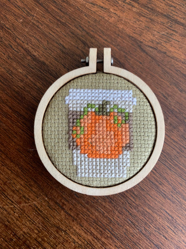This is a fun one! This delisious PSL cup fits a 4 inch hoop when stitched on 14 count Aida. The sample is stitche on sand colored Aida.