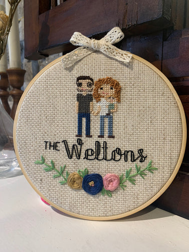 Portraits will be finished on a 6 or 8inch wood hoop depending on the number of characters.