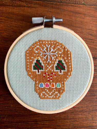 Stitched on an 18count Aida this skull fits nicely in a 4 inch hoop (which is perfect for the tree!)