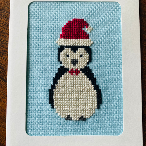 This is a fun one! This festive penguin fits a 4 inch hoop when stitched on 14 count Aida. Finish it in a hoop and hang for everyone to admire it or place it in a photo-card and send it to those you love :)