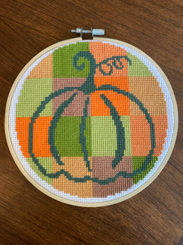 This is a fun one! This pumpkin fits a 6 inch hoop when stitched on 14 count Aida.